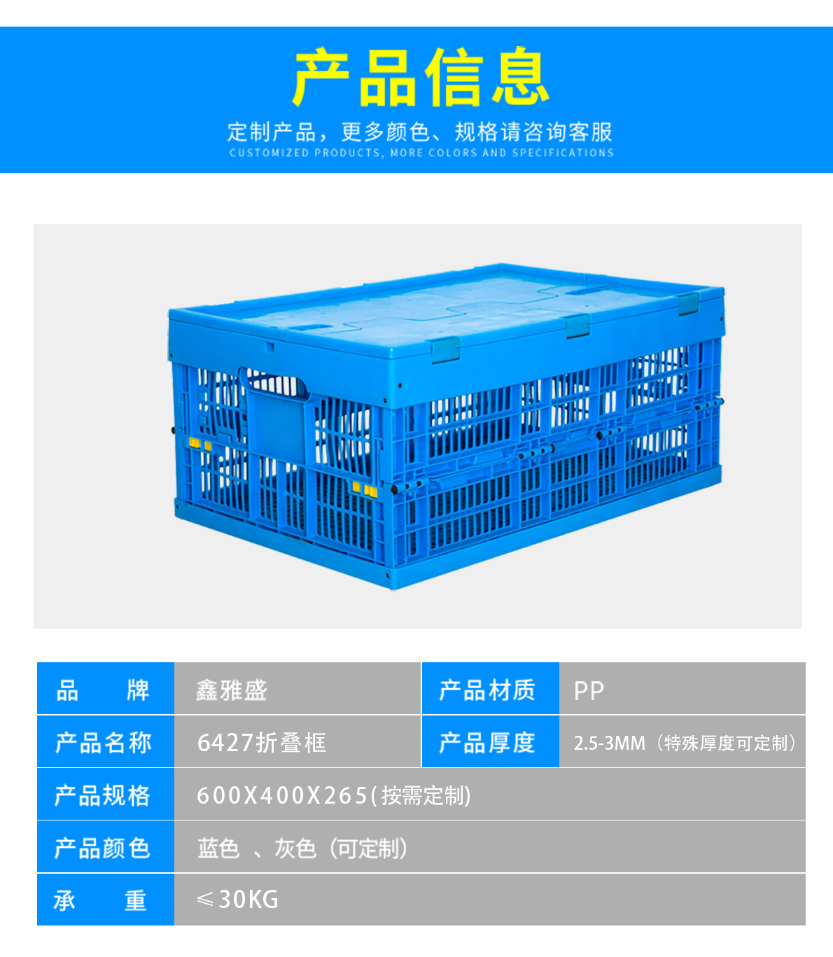 | 折疊筐(含蓋) | 4627折疊筐 | 560*360*255 | 600*400*265 | ≤25 | ≤75 | 2.63 |